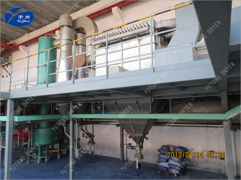 The ambient air filtered by the secondary efficiency air filter is heated to the process setting temperature by the blower into the steam radiator and enters the flash drying machine. The drying process of heat and mass transfer is completed in the drying machine with the filter cake sent to the drying machine by the spiral feeder. The gas-solid mixture is separated and filtered by the cyclone separator and the cloth bag filter. The material is separated from the gas in the drying system, discharged from the drying system, and the tail gas is discharged into the atmosphere by the induced draft fan.