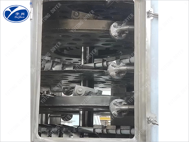 濕物料自加料器連續地加到干燥設備的D1層盤上,帶有耙葉的耙臂做回轉運動,使耙葉連續地翻轉物料,物料沿著指數螺旋線流過干燥盤表面,在低干燥盤上的物料移到外緣,并在外緣降落到下方的高干燥盤外緣,在高干燥盤上的物料向里移動并從中間落料落入下一層低干燥盤中,高低干燥盤上下交替排列,物料得以連續地流過整個干燥設備,中空的干燥盤內通入加熱介質,加熱介質從一端進入另一端導出,已干燥物料從Z后一層干燥盤降落到殼體底層,最后被耙葉移動到料口流出。蒸發出來的蒸汽經設置在頂部的排濕口流出,溶劑經冷凝器收回后經真空泵流出室外。底部流出的干物料冷卻后直接包裝。
