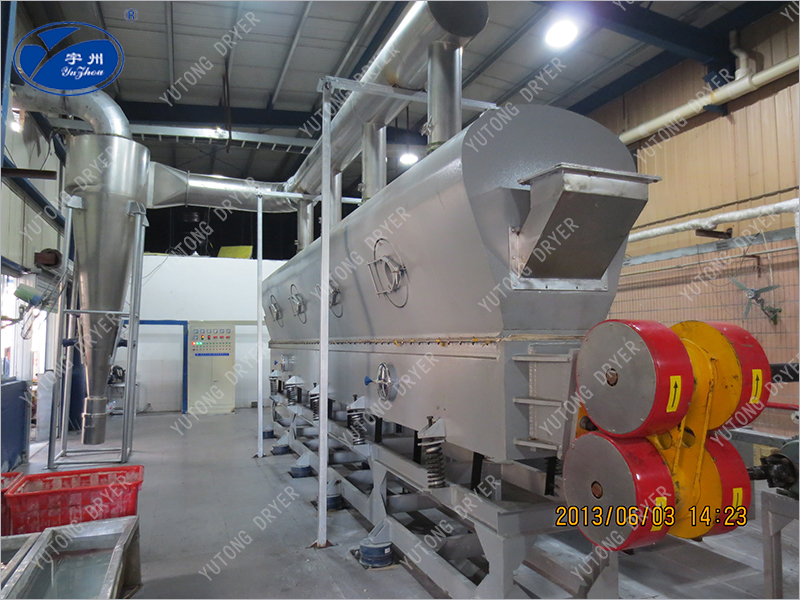 物料自進料口進入機內(nèi),在振動電機或其他方式提供的激振力作用下,在空氣分布板上跳躍前進,同時空氣經(jīng)過濾后,被加熱到一定溫度,由風口進入干燥機下風室中,物料在振動力和經(jīng)空氣分布板均風的熱氣流雙重作用下,呈懸浮狀態(tài)與熱氣流接觸,物料顆粒與熱介質(zhì)之間進行著激烈的湍動,使傳熱和傳質(zhì)過程得以強化,干燥后的產(chǎn)品由排料口排出,蒸發(fā)出的水份和廢氣經(jīng)旋風分離器回收粉塵后,排入大氣。下床體為床層提供了一個穩(wěn)定的具有一定壓力的風室。調(diào)節(jié)引風機,使上箱體中床層物料上部保持微負壓,維持良好干燥環(huán)境并防止粉塵外泄。