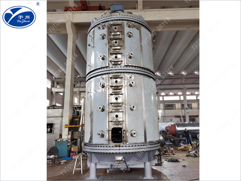 含有溶劑的濕物料通過螺旋加料器連續加入主機加料斗,物料在攪拌電機作用下連續地加到干燥器上部一層干燥盤上,帶有耙葉的耙臂做回轉運動使耙葉連續的翻抄物料,使物料充分吸收熱量,物料沿指數螺旋線流過干燥盤表面,在小干燥盤上的物料被移送到外緣,并在外緣落到下方的大干燥盤的外緣,在大干燥盤上的物料向里移動并從中間落料口落入下層小干燥盤中,大小干燥盤上下交替排列,物料得以連續的流過整個干燥器,中空的干燥盤內通入加熱介質導熱油。加熱介質由干燥盤的一端進入干燥盤面,從另一端導出。已干燥的物料從后一層干燥盤落到殼體的帶冷卻底層,后被耙葉移送到出料口排出進入底部出料螺旋,并經緩沖罐排出機外。濕份溶劑從物料中蒸發汽化后逸出,由設在頂部的緩沖罐沉降后抽出,溶劑經冷凝器冷凝進入緩沖罐回收,濕空氣最后排空。