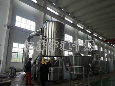 FL型沸騰制粒干燥機:物料粉末粒子,在原料容器(流化床)中呈環形流化狀態。受到經過凈化后的加熱空氣預熱和混合,將粘合劑溶液霧化噴入,使若干粒子聚集成含有粘合劑的團粒,由于熱空氣對物料的不斷干燥,使團粒中的水分蒸發,粘合劑凝固,此過程不斷重復進行,形成理想的、均勻的多微孔球狀顆粒。