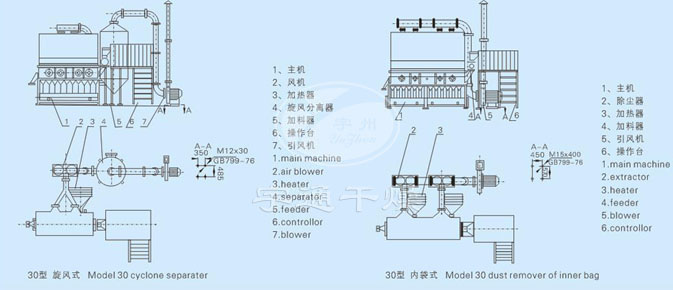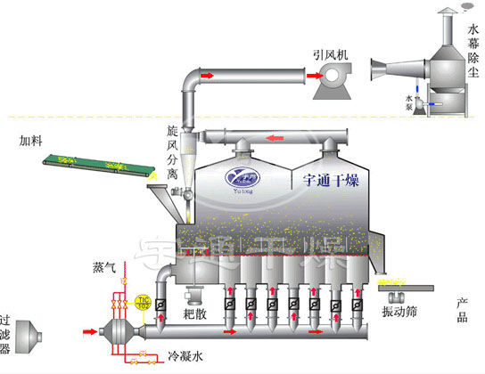 散粒狀固體物料由加料器加入流化床干燥器中,過(guò)濾后的潔凈空氣加熱后由鼓風(fēng)機(jī)送入流化床底部經(jīng)分布板與固體物料接觸,形成流態(tài)化達(dá)到氣固的熱質(zhì)交換。物料干燥后由排料口排出,廢氣由沸騰床頂部排出經(jīng)旋風(fēng)除塵器組和布袋除塵器回收固體粉料后排空。蒸汽、電、熱風(fēng)爐均可配用(按用戶要求配套)。