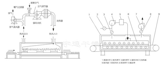 工作時熱風以孔束流由上下同時噴向輸送帶上的物流,由于噴射氣速高達15m/s以上,故對流傳熱的膜極薄,傳熱系數大,干燥速度快,該設備用與不透氣類物料時,上面噴射氣流仍返回上面,下面噴出的氣流仍返回下面,在參與循環。對透氣性物料氣流束具有強穿透性及在物料內部的擴散性。使用熱源可以是蒸汽,電,熱風爐及燃油煙道氣等。