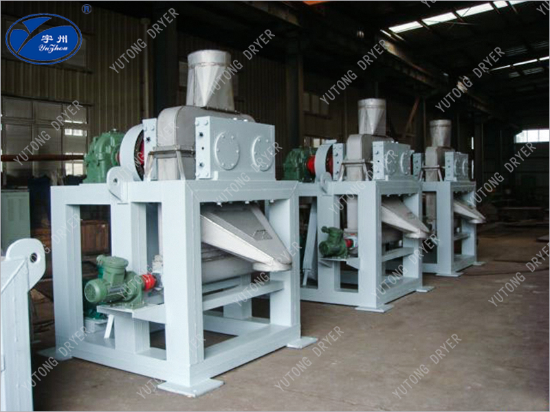 各種干粉物料從設備頂部加入,經脫氣、螺旋預壓進入兩個平等軋輥,軋輥相對旋轉,物料被強制送入兩輥之間,帶槽軋輥將物料咬入輥隙被強制壓縮,物料通過壓縮區后,物料的表面張力和重力使之自然脫出。脫出后的指條狀團塊進入碎粒機由旋轉刀排破碎,被破碎的物料進入整粒機通過滾動刀排使顆粒和部分粉狀物料進入旋振篩進行篩分。合格品通過輸送機被送入成品倉。粉狀篩下物料通過輸送機再次被送回原料倉進行二次輥壓,擠壓力的大小可根據造粒操作的需要由液壓油缸的壓力進行調節。 通過改變輥面開槽形式,可得到片狀、條狀、扁球狀物料。